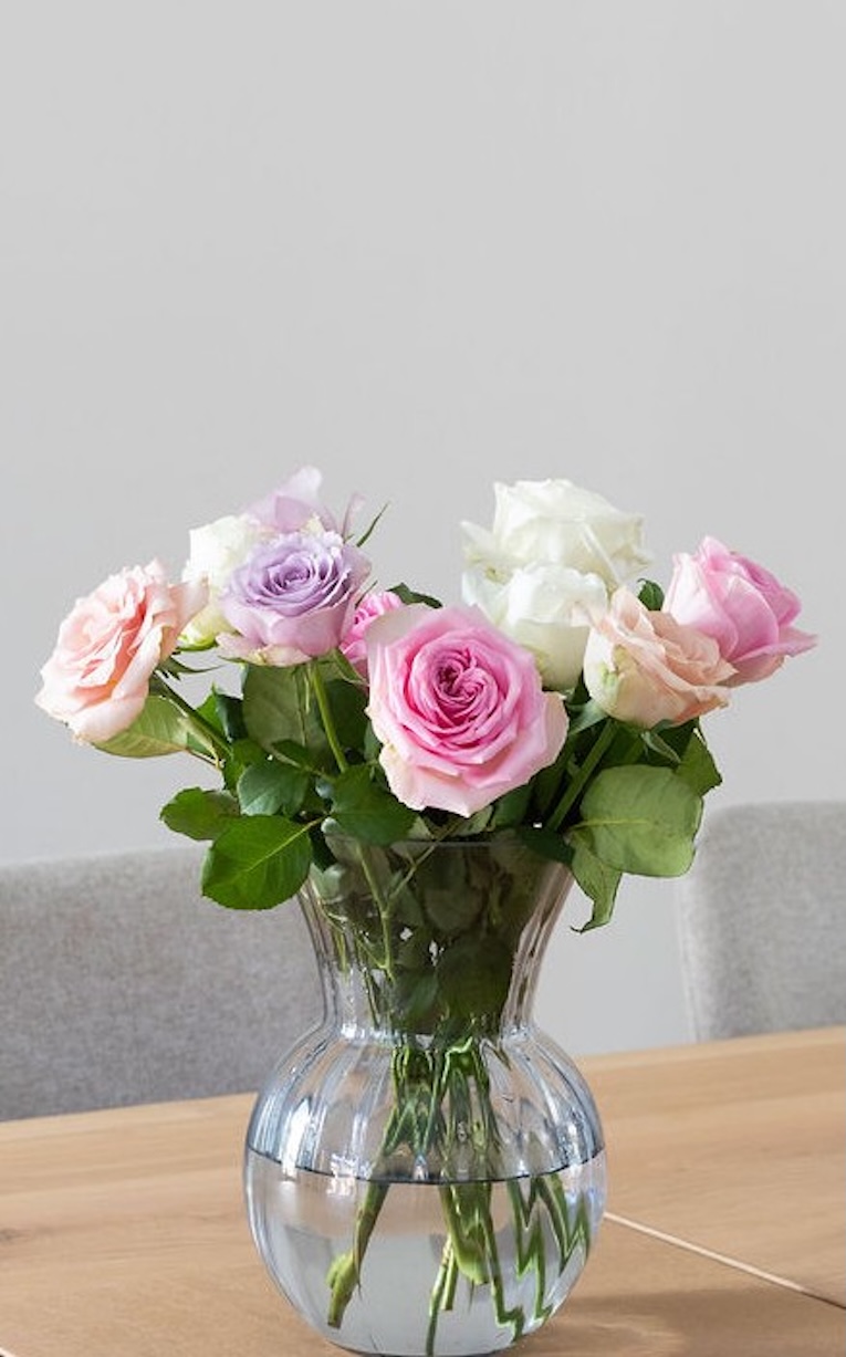 - Snijd de stelen schuin af (1–2 cm) met een scherp mes of schaar. Zo nemen de bloemen beter water op.
